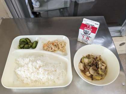 今日の献立は、すき焼き煮・きゅうりのゆず風味・もやしとささみのいためもの・ごはん・牛乳です。