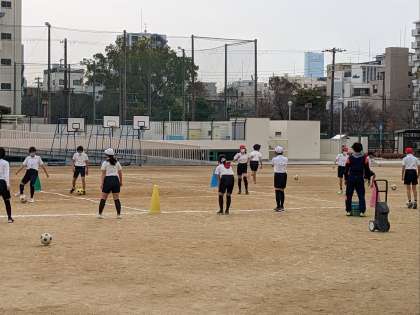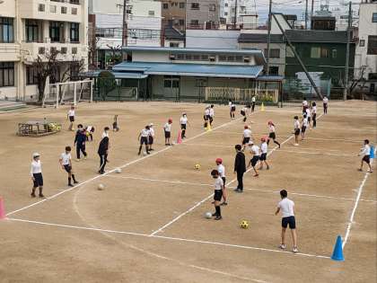 体育の授業の様子です。運動場でサッカーをしていました。念入りにパスの練習をしていました。正確なパスは、試合をする上で最も大切なことです。基本をしっかり身につけましょう。