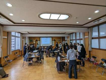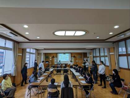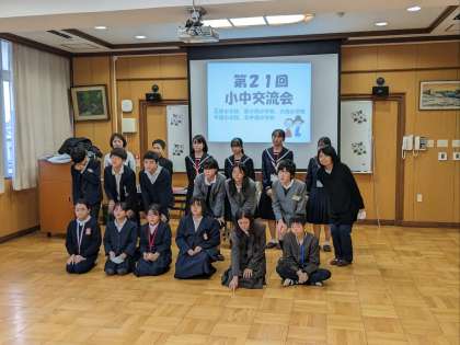 玉津中学校で小中民族学級交流会が行われました。中道からは、7人が参加しました。中学生や他校の小学生とクイズで交流しました。最後にみんなで写真を撮りました。2か月後には一緒に通う仲間です。今日はいい体験ができました。