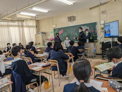 英語の授業の様子です。海外からの転入生の自己紹介を英語で行いました。C−NETが通訳をしてくださいました。黒板には歓迎の言葉が書かれていました。