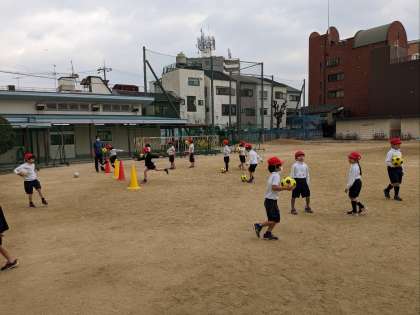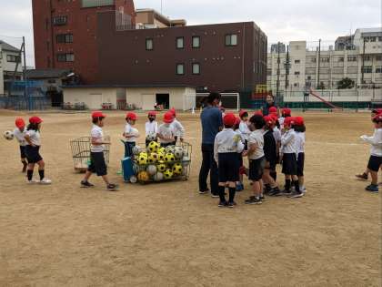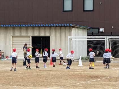 体育の授業の様子です。運動場でボールをける運動をしていました。ゴールに向かって蹴っていました。ボールをタイミングよくけると、強くけることができます。うまくけるのは、難しかったようですが、がんばっていました。
