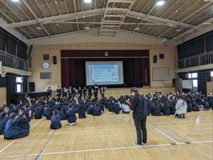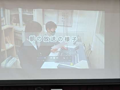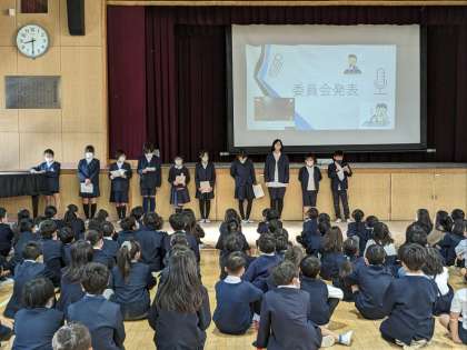 講堂で児童集会を行いました。今日の集会は、情報委員会発表でした。クイズ形式で活動を紹介したり、動画で普段の放送の様子を発表しました。