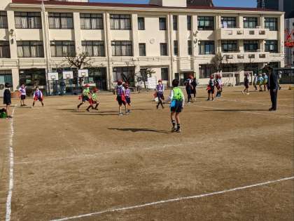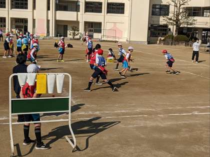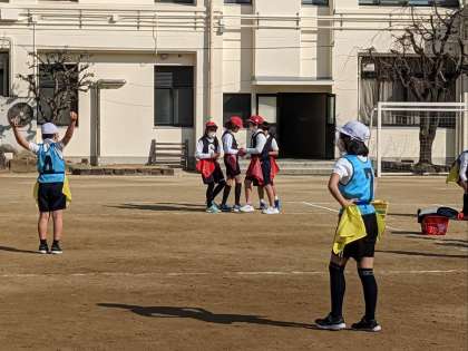 体育の授業の様子です。運動場でフラッグフットボールの試合をしていました。攻めるほうも守るほうも作戦を立てることが重要です。しっかり話し合って試合を楽しみましょう。