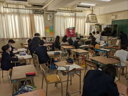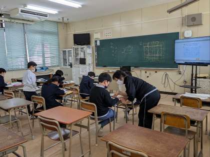 算数の授業の様子です。習熟度別少人数で学習をしていました。図形の問題を解いていました。展開図を書いたり、それを組み立てたりを考えて考えて解かなければいけません。頭の中で図形を想像することが大切です。がんばりましょう。