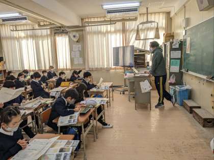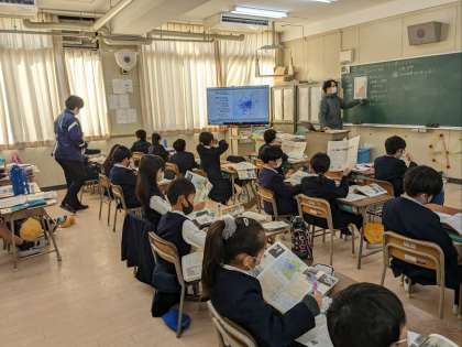 社会科の授業の様子です。大阪市の人口の移り変わりについて考えていました。大阪市は、昔は今より面積が狭く、区の数も少なかったんです。それが拡大して今の大阪市になったことを知りました。子ども達の知的好奇心をくすぐる授業でした。