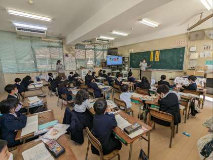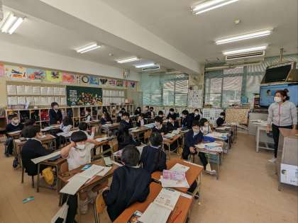 算数の授業の様子です。2けたのたし算を学習していました。色板などを使って、10を1つのまとまりとして考えるとよいことに気づいて、計算することができました。