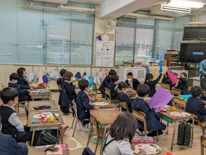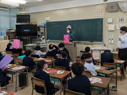 図画工作科の授業の様子です。にらめっこという題で、ユニークな顔を作っていました。顔が完成したら紙版画で仕上げるそうです。刷り上がりが楽しみですね。