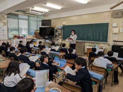 音楽の授業の様子です。〔Twinkle, twinkle, little star〕(きらきら星)を歌っていました。英語でです。教科書も英語で書かれていました。みんなで歌っていました。