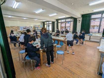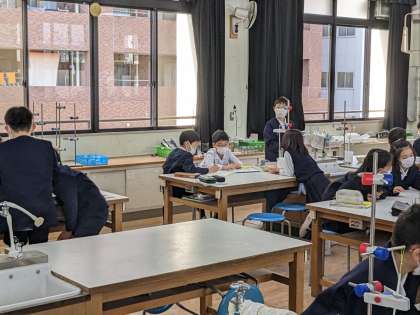理科の授業の様子です。理科室で水を冷やす実験をしていました。時間を決めて温度の変化を記録していました。どんな発見があるのかな?実験は楽しいですね。