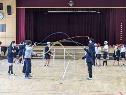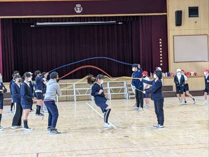体育の授業の様子です。長跳び縄を2本使って縄跳び運動をしていました。タイミングの取り方が難しいのですが、慣れるとスムーズに跳べるようになります。練習をがんばりましょう。
