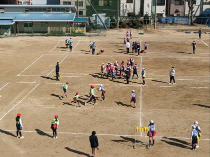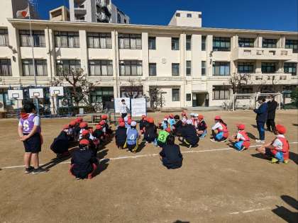 フラッグフットボールは、アメリカンフットボールの小学生版のようなゲームで、チームで作戦を考えてタッチダウンをねらいます。寒い日でしたが、子ども達は多くの先生が見ている中、元気に運動を楽しんでいました。