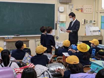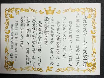 2年生が全員九九を覚えたことから、2年生1組に九九マスター認定証が贈られました。みんなががんばってきた証です。これからも九九を繰り返して練習して使いこなして、忘れないようにしましょう。