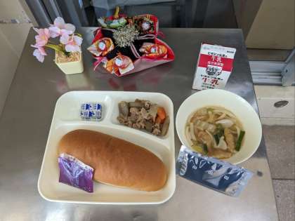 今日のメニューは、豚肉とごぼうの煮もの・なにわうどん・固形チーズ・コッペパン・ブルーベリージャム・牛乳です。