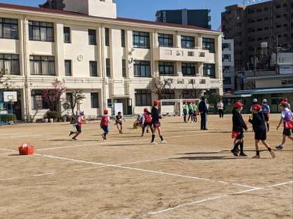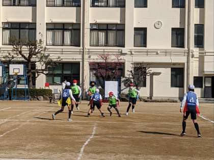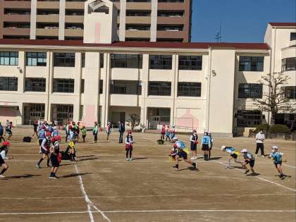 体育の授業の様子です。運動場でフラッグフットボールの試合をしていました。春本番を思わせる絶好の天気の中で、気持ちよさそうに体を動かしていました。