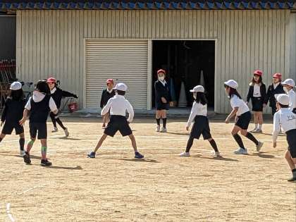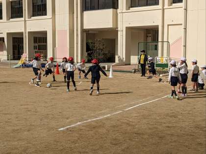 体育の授業の様子です。キックベースボールをしていました。いい天気です。日差しがあり気持ちがいいです。運動するには絶好の天気です。