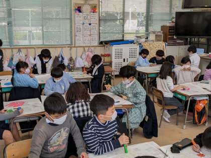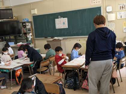 図画工作科の授業の様子です。1年生で作成した作品を持って帰る袋に、思い思いに絵を描いていました。これも立派な作品ですね。思い出の詰まった作品袋は、お家で大切に保管しておきましょう。