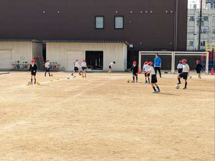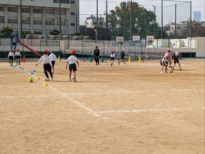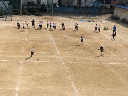 体育の授業の様子です。ボールを使った運動をしていました。細かい足さばきでボールをコントロールする練習をしていました。その後で、ボールをけりながらの折り返しリレーをしていました。うまくボールを操れるようがんばりましょう。