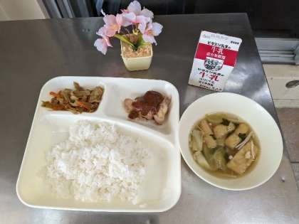 鶏肉のみそバターソースみそバターソース・五目汁・きんぴらごぼう・ごはん・牛乳です。