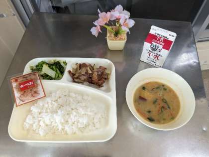 今日の献立は、豚肉の生姜焼き・さつまいものみそ汁・なのはのおひたし・ごはん・牛乳です。