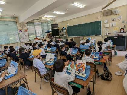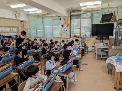 音楽の授業の様子です。先生のオルガンに合わせて合奏していました。「おもちゃのチャチャチャ」を、手拍子を取りながら歌っていました。元気な歌声が外にも響いてていました。