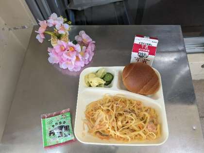 今日のメニューは、さけのクリームスパゲッティ・キャベツときゅうりのサラダ・ソフト黒豆・黒糖パン・牛乳です。