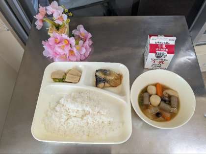 今日の献立は、さごしのおろしじょうゆかけ・高野豆腐の煮物・さといもと野菜の含め煮・ごはん・牛乳です。