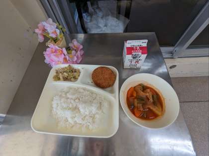 今日の献立は、チキンレバーカツ・ケチャップ煮・ツナとキャベツのバジルソテー・ごはん・牛乳です。