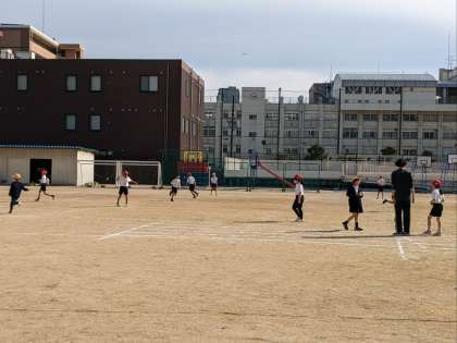 お楽しみ会の様子です。運動場で体育系のお楽しみ会をしていました。リレーをしたり鬼ごっこをしたりと運動場を走り回っていました。子ども達は、汗をかきながら、春のひと時を楽しんでいました。