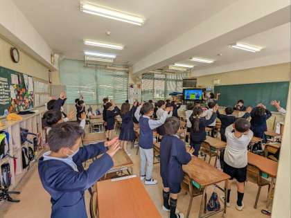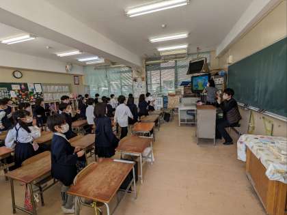 学級活動の様子です。入学式のメッセージビデオを撮っていました。教室に元気な歌が響いていました。曲に合わせてダンスも上手にできていました。