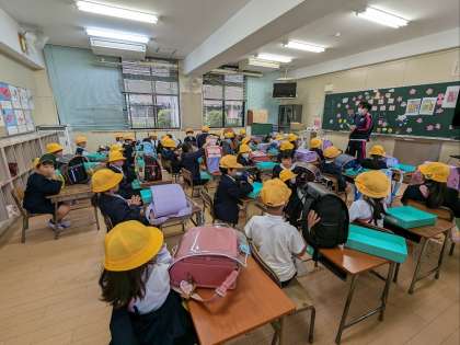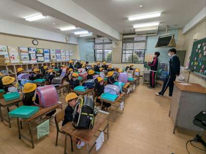 帰りの準備の様子です。4月の中旬まで1年生は、他の学年より早く下校します。みんな下校の準備を済ませて先生の話を聞いています。とてもよい姿勢で待つことができています。素晴らしいです。