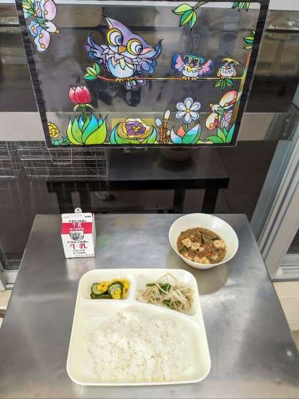 今日の献立は、マーボー豆腐・きゅうりとコーンの甘酢あえ・もやしとピーマンのごま炒め・ごはん・牛乳です。