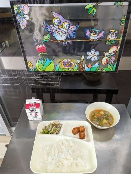 今日の献立は、マグロのオーロラ煮・豚肉と野菜の煮もの・キャベツの赤じそ和え・ごはん・牛乳です。