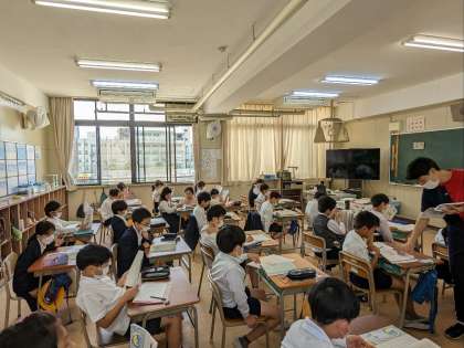 国語の授業の様子です。教科書を読んで感想を書いていました。先生の朗読をを聞きながら、物語に集中していました。どんな感想をもったのか気になりますね。