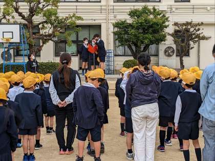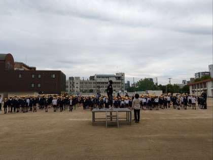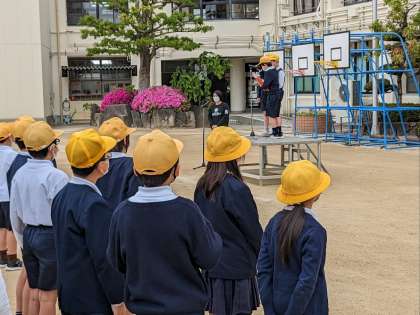 運動場で全校朝会を行いました。健康委員会から、今年度の1回目の姿勢ストレッチを行いました。