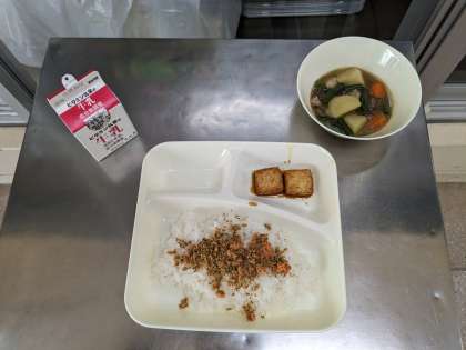 今日の献立は、鶏肉とじゃがいもの煮もの・厚揚げのしょうゆだれかけ・紅鮭そぼろ・ごはん・牛乳です。