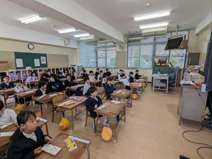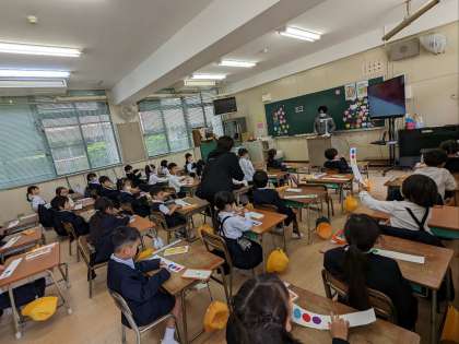 図画工作科の授業の様子です。パスの使い方を学んでいました。先生の指示通りに、みんな円の中に力強く色を塗っていました。