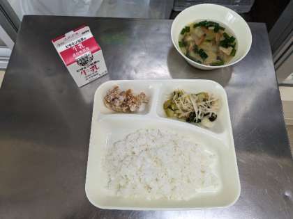 今日の献立は、鶏肉のからあげ・中華スープ・チンゲン菜ともやしの甘酢あえ・ごはん・牛乳です。
