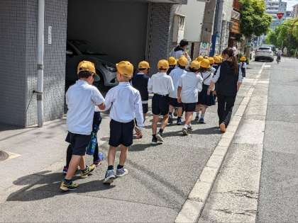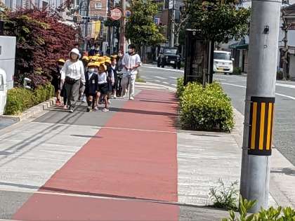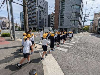 交通安全指導の様子です。5月の遠足を前に、集団での歩行の練習をしました。歩道や信号・横断歩道の歩き方を学びました。普段から交通ルールを守って事故にあわないように気をつけましょう。