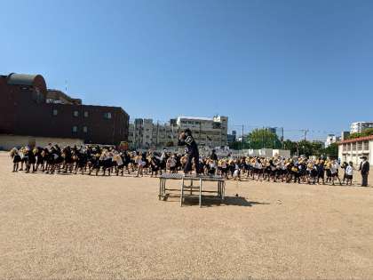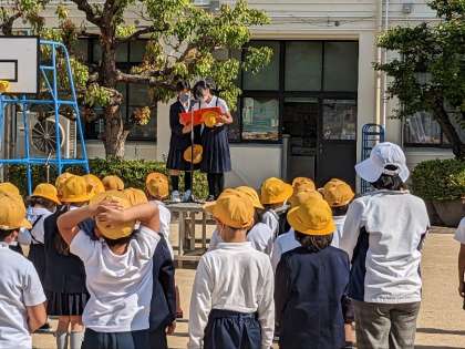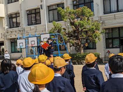 5月になりました。爽やかな晴天のもと運動場で全校朝会を行いました。まず最初に、姿勢ストレッチを行いました。校長先生のお話の後、看護当番から先週の反省と今週の目標についての話がありました。
