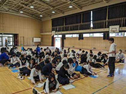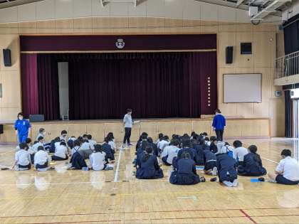 体育の授業の様子です。講堂で、運動会の団体演技の説明を聞いていました。運動会まで後1ヶ月ですね。しっかり話し合って、思い出に残る団体演技ができるようにがんばりましょう。