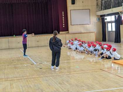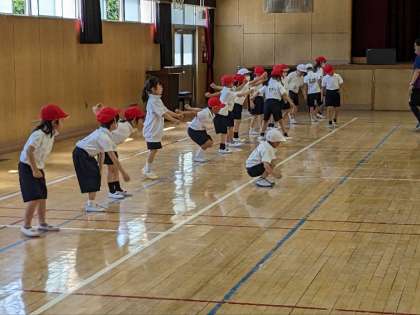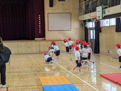 体育の授業の様子です。講堂で跳ぶ運動をしていました。自分で跳ぶ距離を決めて挑戦していました。遠くまで跳べるようにがんばりましょう。