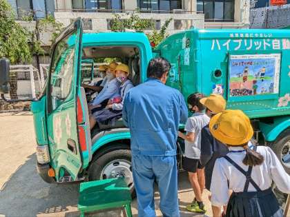 続いて、実際に乗車させてもらったり、パッカー車クイズをしました。子ども達は、たくさんの質問をしていました。ごみの処理についてのいろいろな知識を知ることができました。