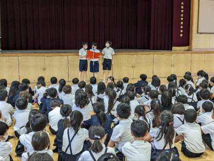 看護当番から先週の反省と今週の目標についての話がありました。今月は、チャイムを守ろうという目標です。しっかりがんばりましょう。