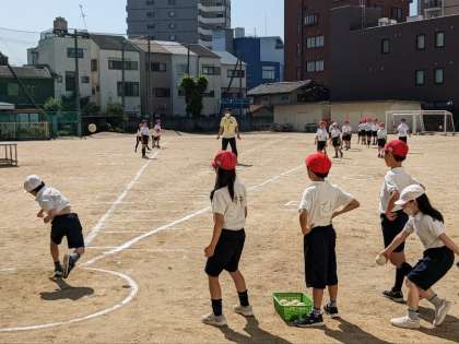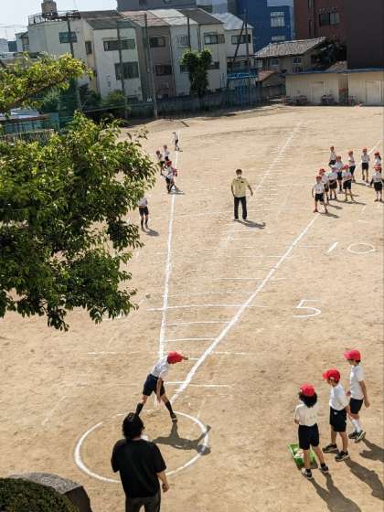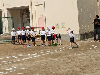 体育の授業の様子です。今日は全学年でソフトボール投げを行います。1時間目の前半は3年の割り当てです。昨年よりも長い距離を投げる子が多くいました。日ごろの運動の成果ですね。
