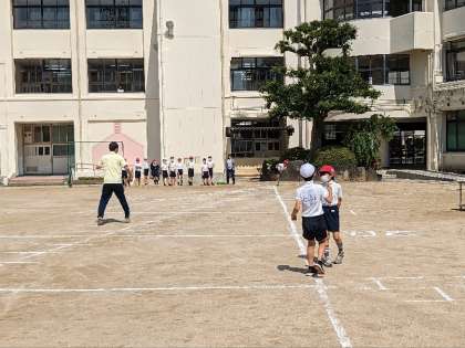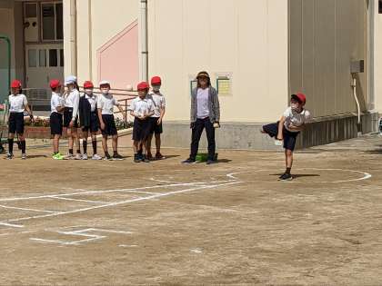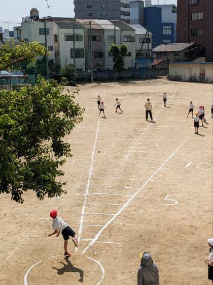 みんなしっかり投げていました。遠くに投げている子は、いいフォームです。これは日ごろの運動の成果ですね。これからも運動の経験を重ねていきましょう。