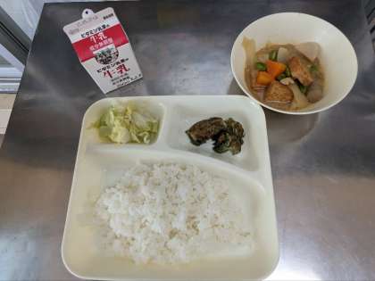今日の献立は、ちくわのいそべあげ・あっさりキャベツ・あつあげとさといものみそ煮・ごはん・牛乳です。