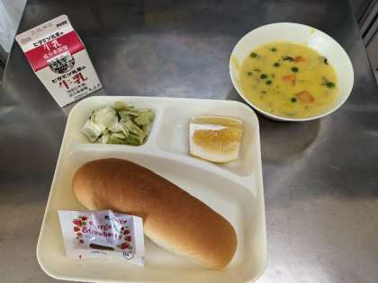 今日のメニューは、コーンクリームシチュー・キャベツときゅうりのサラダ・かわちばんかん・コッペパン・イチゴジャム・牛乳です。
