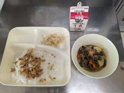 今日の献立は、肉じゃが・もやしのゆず香和え・ごまかか炒め・ごはん・牛乳です。