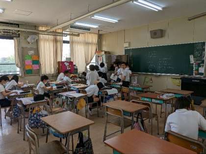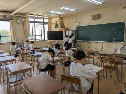 算数の授業の様子です。習熟度別学級2分割で授業を受けていました。体積の問題を解いて答えのチェックをしていました。間違いは今のうちに正しておきましょう。もしわからない問題があれば先生に質問しましょう。