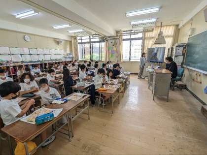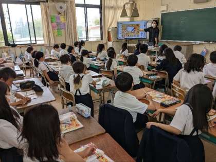 外国語活動の授業の様子です。映像や楽曲を使って数字を覚えていました。C−NETの発音に合わせて歌っていました。今はいろいろな活動を通して、英語に慣れ親しみましょう。